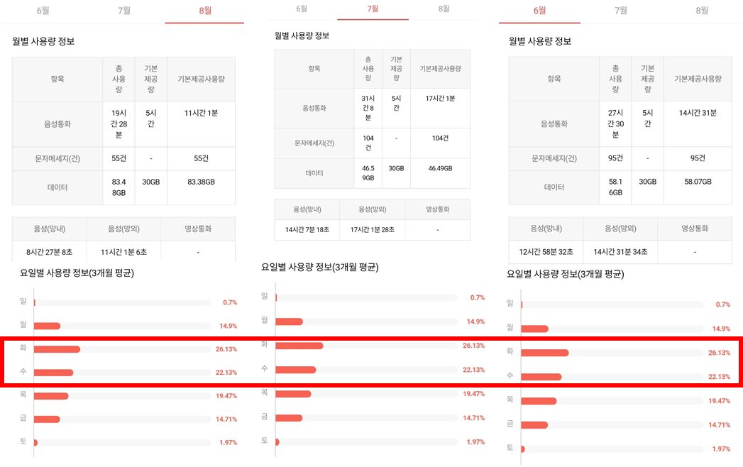 4. 먼저 최근 사용량 탭을 누르기 전에 월별 사용량을 간단하게 비교하면 다음과 같았다.